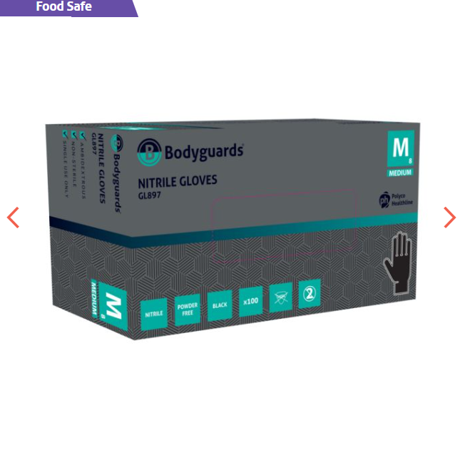 Bodyguards GL897 Black Nitrile light-weight disposable gloves provide durability and reliable protection. They deliver outstanding dexterity and tactile sensitivity, making them highly versatile. Approved for use in diverse industries, including food handling, tattoo artistry, automotive work, and engineering, these gloves provide dependable performance across various demanding applications.