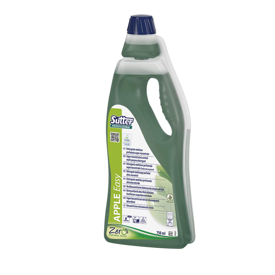 Super concentrated universal scented multi-purpose detergent for the daily cleaning of hard surfaces. Excellent also for scrubbing machine. Also suitable for the cleaning of internal surfaces within boats, ships and other transports. Green apple scent, allergen-free (Reg. 648/2004), delicate and long-lasting fragrance. It contains vegetal origin raw materials (e.g. surfactants, solvents) coming from the processing of corn, potatoes, sugar beet and coconut oil. Phosphate-free, nickel-free (less than 0.01 ppm), cobalt- and chromium-free. The absence of CLP warning signs means that the product is safe both for the operator and the environment, provided it is used according to the usage instructions and to the other information on the label.